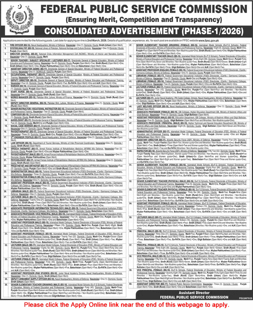 FPSC Jobs 2026 February ke tehat pure Pakistan (Punjab, Sindh, KPK, Balochistan, GB, AJK) ke liye vacancies hain.